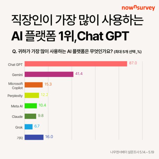 이는 2023년 6월 나우앤서베이의 동일 조사에서 '직장에서 AI사용을 권장한다'는 응답(37%)에 비해, 2년 만에 24%p 증가한 수치다. 이는 AI가 업무 생산성에 실질적으로 기여하고 있다는 인식이 확산된 결과로 해석된다.