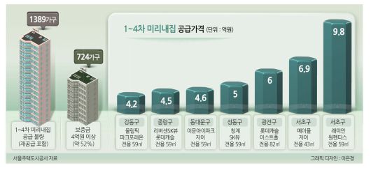 ▶서울시 공공임대도 전셋값 대부분 4억원 넘어…절반 이상 정책대출 혜택 못받아=이 같은 건의가 나온 건 시가 공급하는 신혼부부용 장기전세주택 미리내집의 전셋값이 대부분 4억원을 넘어 주택도시기금 대출을 활용할 수 없다는 비판이 제기됐기 때문이다. 서울시가 신혼부부 주거 안정을 위해 도입한 ‘미리내집’은 신혼부부에게 장기전세주택을 제공하고 자녀 출산 시 거주 기간을 연장하거나 시세의 80~90% 수준으로 분양 혜택을 주는 제도다. 비(非)아파트형 미리내집은 정책대출을 통해 자금을 마련할 수 있는 수준이지만 아파트형은 보증금이 4억원을 넘는 경우가 대다수다. 헤럴드경제가 지난해 7월부터 올해 4월까지 네 차례 이뤄진 미리내집(아파트형) 입주자모집공고를 분석한 결과 전체 공급물량 1389가구(재공급 포함) 중 52%에 달하는 724가구가 전세보증금이 4억원을 넘는 것으로 집계됐다. 특히 지난해 8월 공급된 미리내집 2차의 경우 327가구 중 218가구가 4억원을 초과해 정책대출 혜택을 못 받았다.