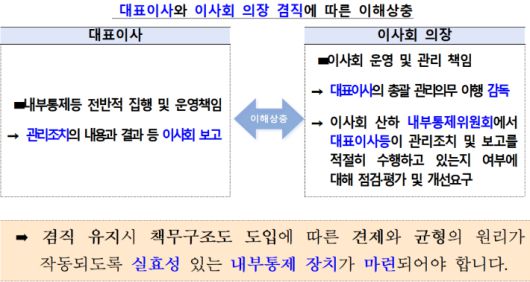 우선 은행·지주와 달리 대형 증권·보험사의 경우, 책무구조도 도입 대상 전체 53개사 중 25개사(47.1%)가 CEO와 이사회 의장이 겸직 상태였다. CEO와 이사회 의장 겸직이 지배구조법상 금지되는 것은 아니지만 견제와 균형 원리가 원활히 작동하지 않을 우려가 있다는 것이 당국 시각이다. 실제로 금감원 지적을 받고 이사회 산하 내부통제위원회 구성을 전원 사외이사로 구성하는 방식으로 우려를 해소한 사례도 있다.