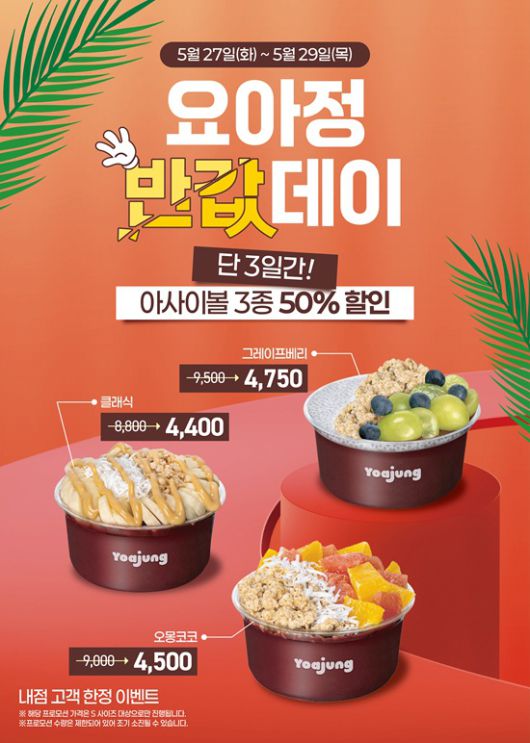 프리미엄 디저트 브랜드 요아정이 오는 27일부터 29일까지 3일간 전국 매장에서 아사이볼 추천 메뉴 3종을 대상으로 50% 할인 이벤트 '반갑데이'를 진행한다고 밝혔다.