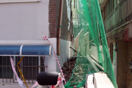 외벽이 부풀어 안전 우려로 주민들이 대피했던 경기 수원시의 한 다세대주택의 외벽 일부가 26일 붕괴했다. 관련 신고가 접수된 지 6일 만이다.
