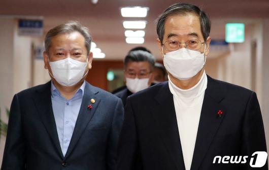 한덕수 전 국무총리(오른쪽)와 이상민 전 행정안전부 장관 2023.1.17/뉴스1 ⓒ News1 김명섭 기자 |
