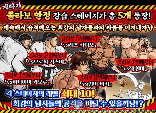 콜라보 한정 강습 스테이지 등장 콜라보 기간 중 5종류의 콜라보 강습 스테이지가 등장한다. 각 스테이지의 레벨은 최대 10이며 ‘한마 바키’에 등장하는 캐릭터들이 강력한 적으로 출현한다.