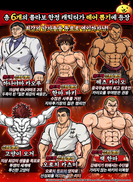 주인공 ‘한마 바키’부터 ‘레츠 카이오’ 등 지금 밖에 손에 넣을 수 없는 콜라보 한정 캐릭터가 다수 참전한다.