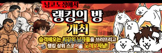 랭킹의 방에 콜라보 이벤트 등장 냥코 도장 ‘랭킹의 방’에서 콜라보 기간 한정 랭킹 이벤트 ‘사상 최강 생물 결정전!’이 개최된다. ‘한마 바키’의 캐릭터들이 다수 등장하는 실력 측정 스테이지이다.