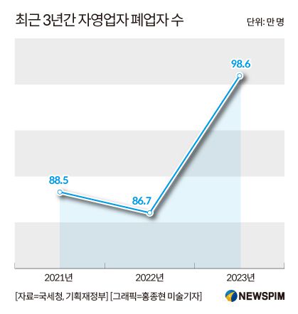 폐업도 급증하고 있다. 국세청의 '국세통계연보'에 따르면, 2023년 한 해 동안 폐업 신고한 사업자는 98만6487명으로 1년 전보다 약 12만명 늘었다. 전체 사업자 중 폐업자 비중은 9.9%에 달했다. 특히 소매업과 서비스업, 음식점업 등 내수 경기와 직접 연관된 업종에서 폐업이 크게 늘었다.