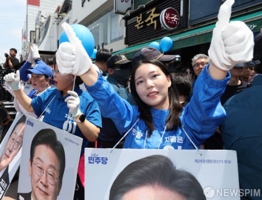 [수원=뉴스핌] 정일구 기자 = 이재명 더불어민주당 대선 후보 유세가 열린 26일 경기 수원 팔달문 영동시장 입구에서 선거운동원들이 이 후보의 지지를 호소하고 있다. 2025.05.26 mironj19@newspim.com |