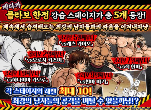 또한, '콜라보 한정 스테이지'인 '지상 최강의 남자들'이 개최되어 클리어 시 이벤트 뽑기 티켓 '전설의 덤벨'을 획득할 수 있으며, 콜라보 EX캐릭터 '고양이 바키', '고양이 카이오', '고양이 돗포'가 등장할 예정이다.