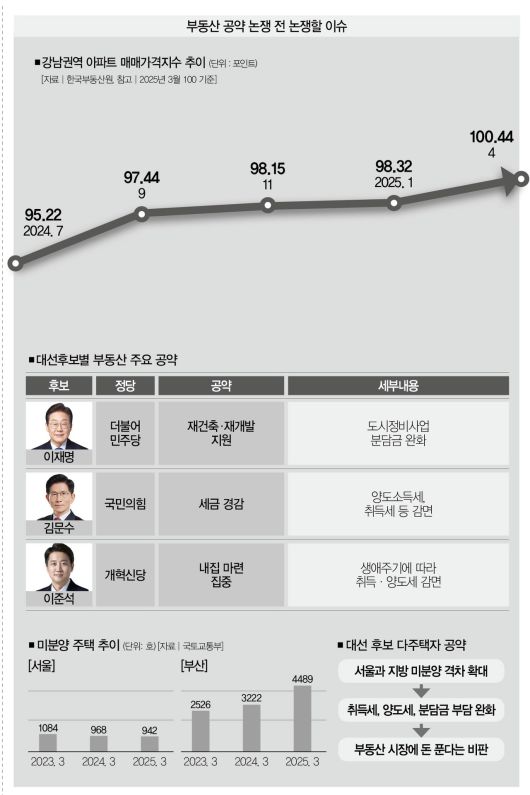 ■ 논쟁➋ 쌓여가는 지방 미분양 = 미분양 지표로 확인해도 서울과 서울이 아닌 지역의 부동산 시장은 분위기가 크게 다르다. 국토교통부에 따르면, 서울의 미분양 주택은 2023년 3월 1084호에서 2024년 3월 968호, 2025년 3월 942호로 차츰 감소했다. 반면 같은 기간 부산의 미분양 주택은 2526호, 3222호, 4489호로 조금씩 늘었다.