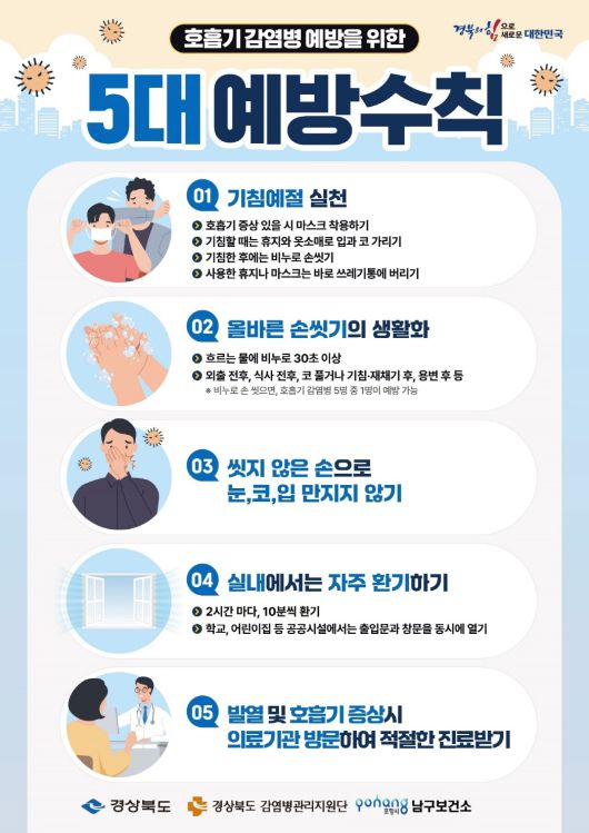 이에 따라 포항시는 일상생활 속에서 ▲기침 예절 실천 ▲올바른 손 씻기 생활화 ▲씻지 않은 손으로 눈·코·입 만지지 않기 ▲실내 자주 환기 등 기본적인 방역수칙을 지속적으로 준수할 것을 권고했다.