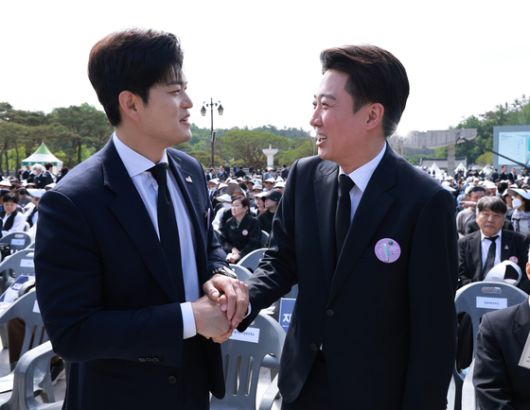 개혁신당 이준석 대통령 후보와 국민의힘 김용태 비상대책위원장이 18일 광주광역시 북구 국립 5·18민주묘지에서 열린 5·18민주화운동 45주년 기념식에서 인사하고 있다.연합뉴스 |