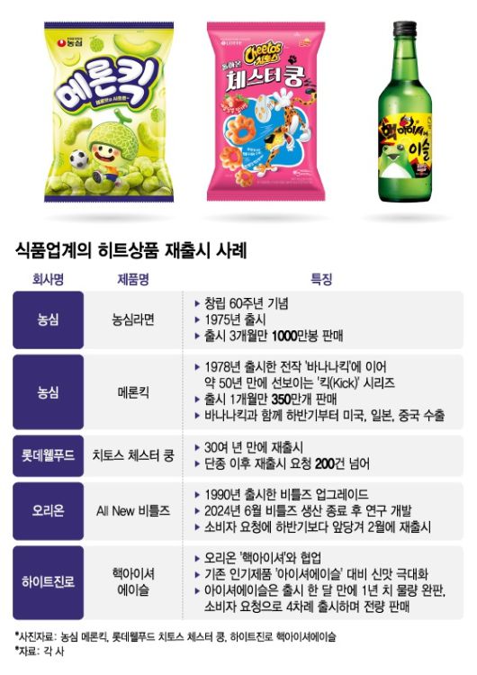롯데웰푸드도 30여년 만에 '치토스 돌아온 체스터쿵' 새콤달콤 딸기맛을 새롭게 선보였다. 체스터쿵은 1990년대 중반 출시돼 치토스의 마스코트인 '체스터'의 발바닥을 형상화한 독특한 모양과 달콤한 맛으로 많은 사랑을 받은 과자다. 오리온 역시 1990년 출시한 츄잉캔디 '비틀즈'를 재단장한 'All New 비틀즈'를 다시 팔고 있다. 가격은 그대로 유지하면서 제품력을 강화했다.