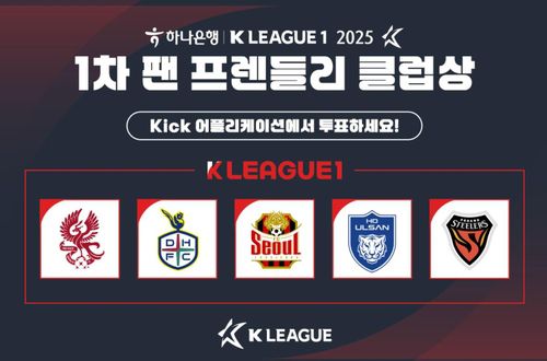 (서울=연합뉴스) 이영호 기자 = 한국프로축구연맹이 2025시즌 1차 K리그1 '팬 프렌들리 클럽상' 팬 투표를 27~29일 실시한다고 26일 밝혔다.