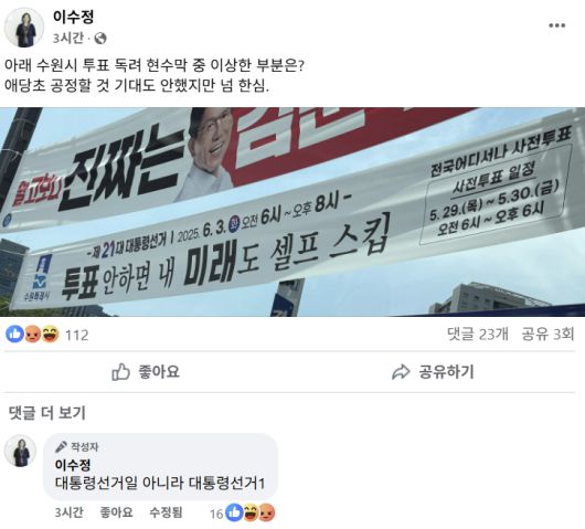 이 위원장은 26일 자신의 페이스북에서 경기 수원시가 내건 6·3 대선 투표 독려 현수막 사진을 올리며 “아래 현수막 중 이상한 부분은? 애당초 공정할 것 기대도 안 했지만 너무 한심”이라고 했다.