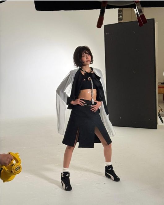 후반부에는 블랙&화이트 재킷을 걸치고, 주얼 장식 벨트와 하이탑 스니커즈를 매치한 룩으로 콘셉트를 바꿨다. 여신미와 힙한 에너지가 동시에 살아나는 이 조합은 화보가 아니라 한 편의 뮤직비디오 같았다는 반응도 나왔다.