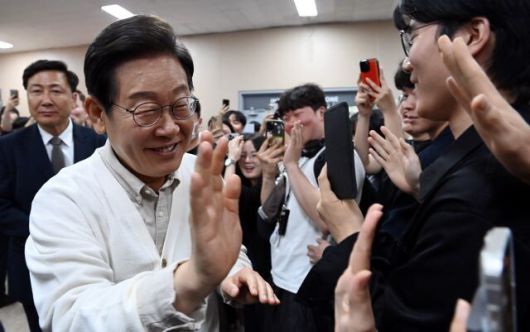이재명(왼쪽) 더불어민주당 대통령 후보가 26일 오전 경기 수원시 영통구 월드컵로 아주대학교에서 열린 ‘아주대와 함께하는 대학생 간담회’를 마친 뒤 학교를 떠나며 학생들과 하이파이브를 하며 인사하고 있다. 공동취재사진 |