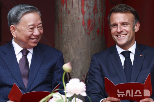 [하노이(베트남)=AP/뉴시스]에마뉘엘 마크롱 프랑스 대통령(오른쪽)이 26일 베트남 하노이 반미우에서 또 람 베트남 공산당 총서기와의 오찬에 참석하고 있다. 그는 이날 베트남 저가항공사 비엣젯이 에어버스의 A330-900 항공기 20대를 구매하는 것을 포함해 12건이 넘는 국방, 원자력, 무역 협정에 서명, 베트남에 46%의 관세를 부과할 것이라는 도널드 트럼프 미 대통령의 발표에 따른 미-베트남 간극을 파고들며 베트남과 프랑스 간 더욱 긴밀한 협력을 촉구했다. 2025.05.26. |