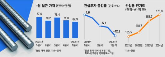 산업용 전기료 급등도 부담이다. 한국전력은 작년 10월 주택용과 일반용 전기요금은 동결하고, 산업용 전기만 평균 9.7% 인상했다. 작년 말 산업용 전기료는 판매단가 기준 2년 만에 46%나 올랐다.
