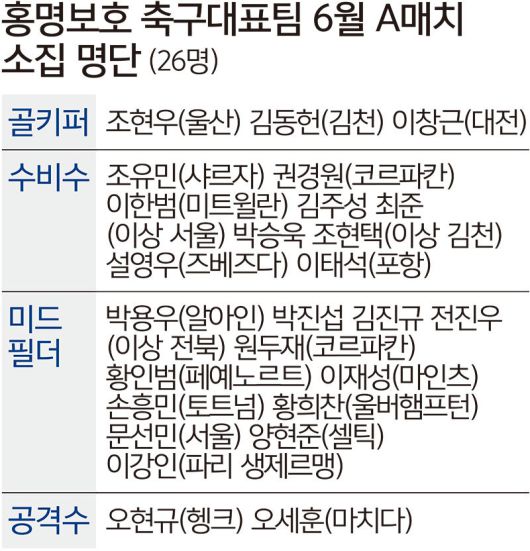 손흥민(33·토트넘)과 이강인(24·파리 생제르맹), 이재성(33·마인츠), 황인범(29·페예노르트) 등 기존 유럽파 선수 대부분 승선했다. 독일 분데스리가 뮌헨 우승에 힘을 보탠 ‘철기둥’ 김민재(29)는 아킬레스건 부상으로 제외됐다. 김민재 빈자리는 이한범(23·미트윌란)이 채울 예정이다. 미드필더와 센터백을 모두 볼 수 있는 ‘멀티 플레이어’ 박진섭(29·전북)은 지난해 3월 월드컵 2차 예선 이후 1년3개월 만에 대표팀으로 복귀한다. 홍 감독 체제에서 박진섭이 뽑힌 건 처음이다.