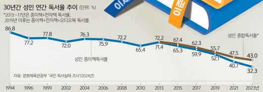 최근 유권자는 종이책보다는 디지털 기기로 정보를 접하지만 공약은 여전히 과거 형식 속에 갇혀 있다. 문화체육관광부가 지난해 발표한 통계자료를 보면 2023년 성인의 종합독서율은 43.0%로, 1994년 첫 조사(86.8%) 이래 역대 최저치를 기록했다. 성인의 종이책 독서율도 조사를 시작한 2013년부터 지금까지 꾸준히 하락세다.