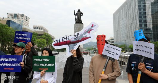 “환경을 생각하는 대통령을” 환경단체 활동가들이 지난 19일 서울 광화문광장에서 제21대 대통령 선거 후보들에게 기후정책 의제를 제안하는 기자회견을 하고 있다. 서성일 선임기자 |