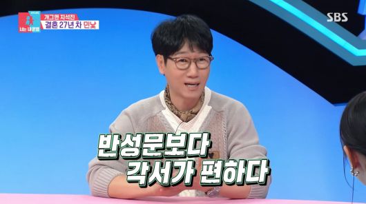 "모든 부부가 위기는 있다"고 입을 연 지석진은 "저희 부부도 위기가 있었지만, 잘 넘겼다"고 밝혔다. 김숙이 "반성문 쓰는 거로 유명하잖냐"고 묻자 그는 "반성문보다 각서가 편하다는 말은 했다. 반성문은 내가 생각해야 하고, 각서는 받아쓰면 되니까"라고 이유를 설명해 배꼽을 쥐게 했다.