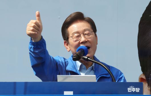 이재명 더불어민주당 대선후보가 26일 오후 경기 용인 단국대 죽전캠퍼스 앞에서 열린 유세에서 지지를 호소하고 있다. /남강호기자 |