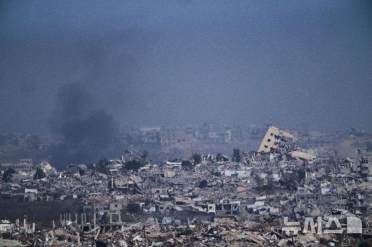 [가자지구=AP/뉴시스] ??이스라엘군이 가자지구 내 학교와 주택을 공습해 최소 54명이 사망한 것으로 전해졌다. 사진은 26일(현지 시간) 이스라엘 남부에서 바라본 가자지구 모습. 2025.05.27 |