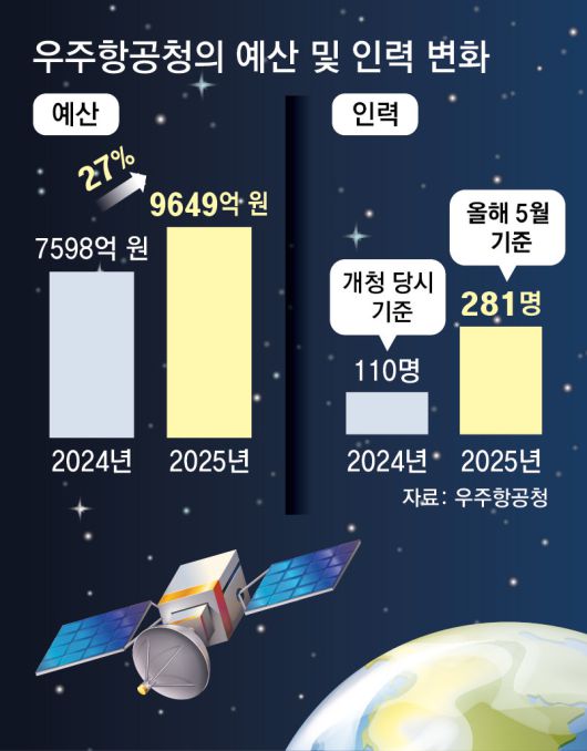 우주항공청이 안착하며 가시적 성과도 나타나고 있다. 우주항공청은 지난 1년간의 주요 성과를 10가지로 정리했는데, 그중 첫 번째는 인력 확충이다. 개청 당시 110여 명이었던 인력은 현재 281명으로 늘었다. 이 중 절반 이상이 전문 인력이다. 또 미국 워싱턴에서 ‘한미 민간우주대화’를 개최하는 등 국제 협력과 공동 연구도 확대했다. 예산 역시 지난해 7598억 원에서 올해 9649억 원으로 27% 증가했다. 다만 국내총생산(GDP) 대비 예산 비중이 0.02%에 불과하다는 점에서 추가 증액이 필요하다고 전문가들은 제언했다.