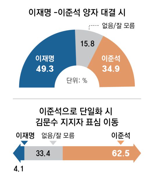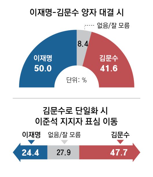 더불어민주당 이재명 대선 후보가 보수 진영 후보가 누구로 단일화가 되든 50%에 이르는 지지율을 유지하는 것으로 나타났다. 이재명 후보와 김문수 후보 간 양자 대결에서 이재명 후보는 50.0%를, 김 후보는 41.6%를 기록했다. 이재명 후보와 이준석 후보의 양자 대결 시 이재명 후보는 49.3%로, 이준석 후보는 34.9%로 집계됐다. 김 후보와 이준석 후보 간 단일화에 대해 찬성은 41.5%, 반대는 42.2%로 조사됐다. 하지만 국민의힘 지지층의 86.2%가 단일화에 찬성한 반면에 개혁신당 지지층은 58.9%가 반대하는 것으로 나타났다.