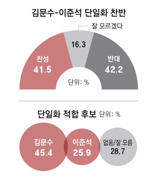 보수 진영 단일화에 대한 찬반은 팽팽하게 맞섰다. ‘단일화를 해야 한다’(찬성)는 응답은 41.5%, ‘단일화를 하지 말아야 한다’(반대)는 답변은 42.2%로 집계됐다. 잘 모르겠다는 응답자는 16.3%였다.
