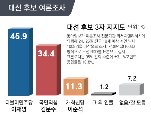 26일 동아일보가 여론조사기관 리서치앤리서치에 의뢰한 여론조사 결과 “내일이 투표일이라면 누가 대통령이 되는 것이 가장 좋다고 생각하느냐”는 질문에 이재명 후보라는 응답은 45.9%였다. 김 후보는 34.4%, 이준석 후보는 11.3%로 조사됐다.