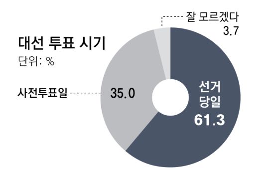 이번 대선에서 반드시 투표하겠다고 답한 ‘적극 투표층’ 중에서는 이재명 후보를 꼽은 응답이 48.9%, 김 후보 35.6%, 이준석 후보 10.2%였다.