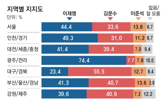 이재명 후보는 서울과 인천·경기 등 수도권과 광주·전라에선 오차범위 밖의 우세를 보였다. 하지만 주요 선거마다 ‘캐스팅보터’ 역할을 해 온 대전·세종·충청에선 이재명 후보가 41.4%, 김 후보가 39.4%로 오차범위 내 접전을 벌였다. 이에 앞서 채널A가 리서치앤리서치에 의뢰해 21일 발표한 조사(19, 20일 전국 1014명 조사. 95% 신뢰 수준에 표본오차 ±3.1%포인트. 응답률은 16.0%)에선 대전·세종·충청에서 이재명 후보가 45.4%, 김 후보가 39.5%였다.