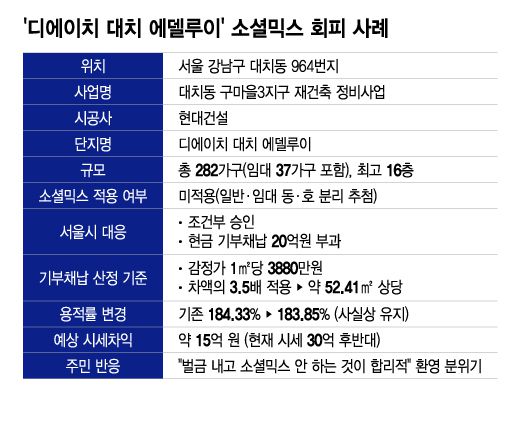오는 8월 입주를 앞둔 서울 강남구 대치동의 한 재건축 아파트 단지가 소셜믹스 원칙을 사실상 거부했지만 서울시가 이를 '20억원 현금 기부채납' 조건으로 받아들이면서 정책 실효성 논란이 예상된다.