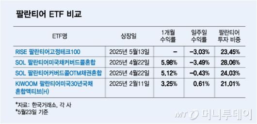 이처럼 수익률 차이가 나는 것은 각 ETF의 팔란티어 투자 비중과 운용 방식이 다르기 때문이다. 지난 13일 상장한 RISE 팔란티어고정테크100 ETF를 제외한 3종은 팔란티어 주식에 채권을 합친 단일 종목 ETF다.