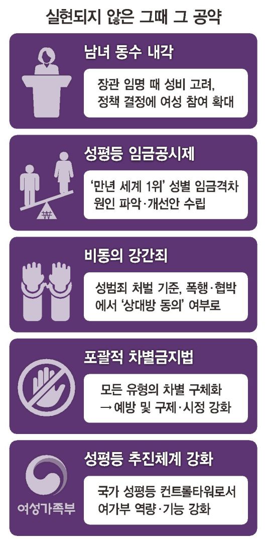 반면 2024~2025년 응원봉 광장이 연 21대 대통령 선거에선 내각 여성 할당처럼 정책 결정 과정에서 여성 참여 등을 확대해 다양한 목소리를 반영하기 위한 공약을 찾아보기 힘들다. 한겨레는 지난 20여년간 여성·성소수자 단체가 줄기차게 요구했으나 아직도 현실이 되지 못한 공약 5가지를 추려 그 역사를 짚었다. 정치권이 성평등과 차별 철폐 요구를 받아안지 못하고 뒷걸음질 친 기록이다.