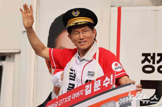 김문수 국민의힘 대선 후보가 21일 오후 경기도 파주시 야당동 새암공원에서 열린 '더 편하게 더 든든하게' 유세에서 GTX 기관사 모자를 쓰고 다음 유세장으로 출발하고 있다. 파주=황진환 기자 |
