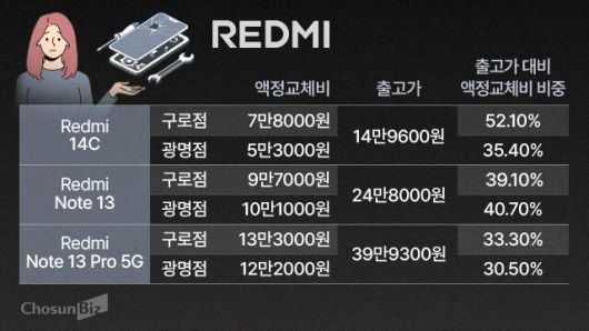 27일 조선비즈 취재에 따르면 국내 샤오미 AS센터들은 스마트폰 액정 교체비가 천차만별인 것으로 파악됐다. 샤오미 스마트폰 ‘레드미14C’의 경우 광명점은 5만3000원, 구로점은 7만8000원의 액정 교체비를 각각 안내했다. ‘레드미노트13’는 광명점은 10만1000원, 구로점은 9만7000원으로 차이가 났다. ‘레드미노트13 프로 5G’의 액정 교체비도 구로점은 13만3000원인데, 광명점에선 12만2000원으로 상이했다. 최근 국내 출시한 ‘샤오미 울트라15’의 액정 교체비를 물었지만, 두 지점 모두 “아직 수리 단가표가 나오지 않았다”면서 가격 안내를 해주지 않았다.