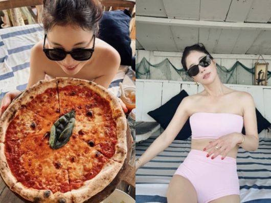 이날 공개된 사진에는 발리 한 리조트에서 여유를 즐기는 기은세의 모습이 담겼다. 그는 핑크색 튜브탑 비키니 차림으로 와인을 마시고 피자를 먹으며 시간을 보내고 있다. 얼굴의 몇 배는 돼 보이는 크기의 피자를 먹고서도 유지되는 탄탄한 몸매가 감탄을 자아냈다. 선글라스를 착용한 채 햇볕을 받는 모습도 시선을 끌었다.