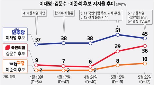 김문수 후보는 윤석열 전 대통령의 비상계엄 문건 파장과 당내 경선 과정에서의 내홍으로 출발이 흔들렸지만 지지율을 회복하며 이재명 후보와의 격차를 줄이고 있다. 특히 이준석 후보와의 단일화를 통해 대역전극을 타진하고 있다. 국민의힘도 이준석 후보와의 단일화에 적극적이다. 김용태 비상대책위원장은 “친윤 청산까지 할 수 있다”며 단일화를 위해 당 개편 가능성까지 시사했다. 이준석 후보에게는 “단일화 조건이 있다면 공식 제안해 달라. 당도 반성 중”이라고 강조했다.