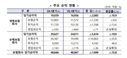 27일 금융감독원이 공개한 '2025년 1분기 보험회사 경영실적(잠정)'에 따르면 보험사들의 올해 1분기 당기순이익은 4조967억원으로 전년동기보다 7699억원(16%) 감소했다.