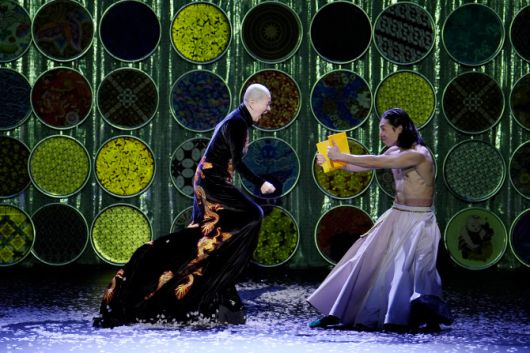 먼저 동아시아 여러 국가에서 사용되는 신묘한 무늬와 그림으로 채색된 수백 개의 쟁반 오브제는 무대미술 그 이상의 아우라로 다가왔다. 이윽고 두 명의 무용수가 기괴한 동물처럼 상하수로 등장해 공간을 채워나간다. 이들을 감싼 의상은 치마로 조끼로 꽃모자로 바뀌며 변화무쌍한 기예적인 움직임을 펼친다.