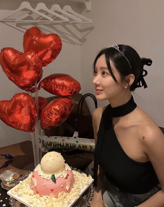사진 속 한그루는 왕관을 쓴 채 생일 케이크 앞에서 환한 미소를 짓고 있다. 특히 하트 풍선과 핑크빛 케이크가 어우러진 테이블 세팅은 마치 동화 속 한 장면처럼 로맨틱한 분위기를 자아낸다.