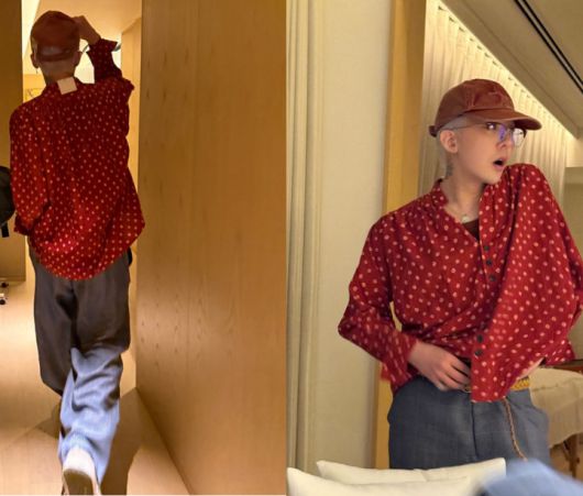 그러나 그 속에서도 셔츠의 비비드한 레드 컬러감, 2025 트렌드로 떠오르는 도트 패턴의 포인트 등으로 개성을 추가해 감도 높은 캐주얼룩을 완성했다.