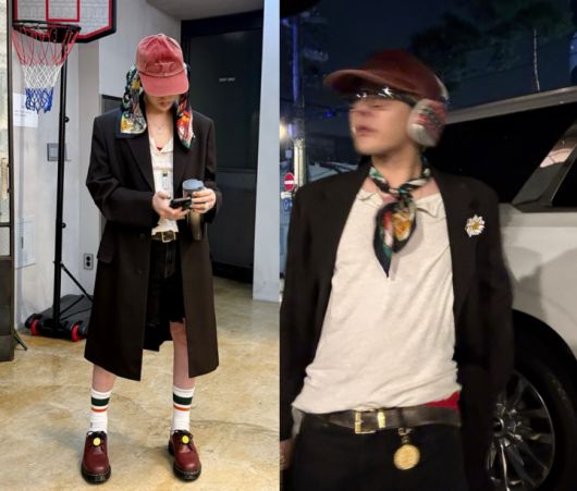 하의는 짙은 초콜릿 브라운 컬러의 코듀로이 팬츠로 캐주얼 함을 극대화했으며, 슈즈로는 종종 착용하는 것으로 알려진 브랜드 '메종 미하라 야스히로'의 '베이커 캔버스 로우탑 스니커즈 멀티'를 착용해 양쪽 컬러가 다른 포인트로 특유의 자유로운 스타일링 감성을 드러냈다. 모자로는 연회색 뉴스보이 캡을 매치하여 전반적으로 레트로 빈티지 캐주얼 무드를 내는 코디를 완성했다.