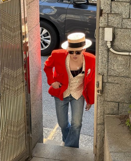 지난 17일엔 유튜브 '할명수' 촬영 당시의 사진을 업로드했다. 이날 지드래곤은 강렬한 레드 컬러의 트위드 카디건과 데님 플레어 팬츠를 매치해 개성 넘치는 레트로 패션을 선보였다.