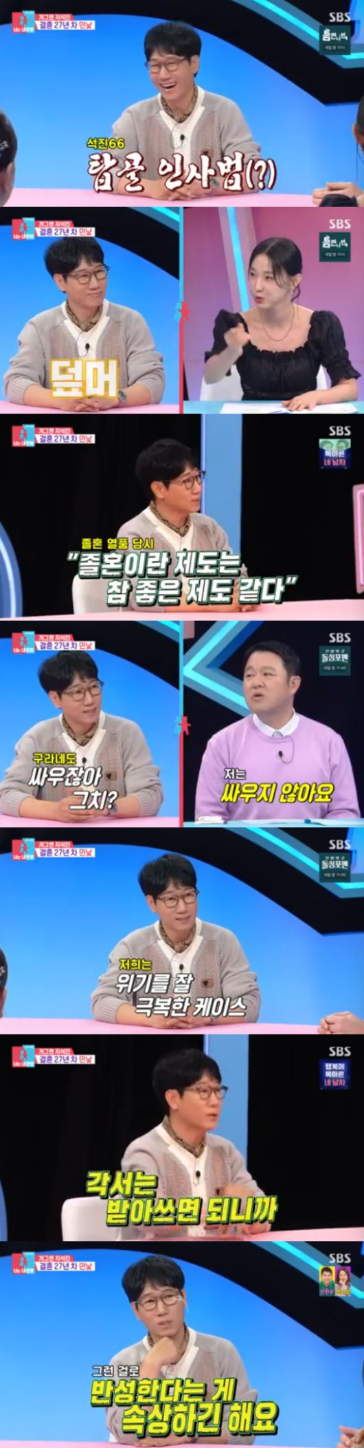 이어 "졸혼 열풍이 불 때 졸혼에 대해 '좋은 제도인 것 같다'고 했던 것 같다. 이혼보다는 낫지 않냐"면서 "안 싸우는 부부는 없지 않냐. 모든 부부가 위기가 있다. 저는 그 위기를 잘 극복했다"고 말했다.