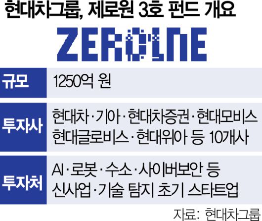 제로원 3호 펀드는 총 1250억 원 규모로 조성됐다. 현대차와 기아(000270)가 각 400억 원, 현대차증권이 100억 원을 출자해 공동으로 기획·운영하는 역할을 맡았다. 현대모비스(012330)와 현대글로비스(086280)·현대위아(011210)·현대로템(064350)·현대오토에버(307950)·현대비앤지스틸(004560)·현대캐피탈 등 7개 그룹 관계사도 각각 출자해 투자자로 참여했다.