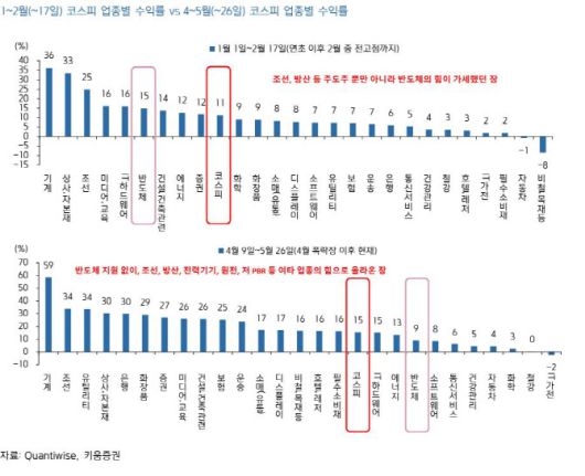 특히 한 연구원은 “현재 코스피는 2640포인트대를 회복하면서, 4월 9일 저점 대비 약 15%대 반등세를 시현했다”며 “코스피 내 시가총액 비중이 가장 큰 반도체의 주가 상승에 기대지 않고, 방산 등 여타 업종의 주가 상승세 만으로 2600선에 재진입했다”고 짚었다.